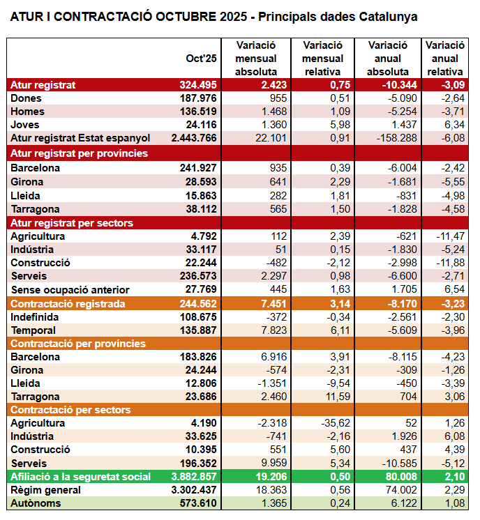 En referència a les persones aturades de més de 45 anys, l’atur s’eleva fins a 188.807 persones, és a dir, augmenta en +677 persones respecte al mes de setembre (+0,36%). No obstant, a nivell interanual, aquesta xifra decreix en -6.688 persones menys (-3,42%). Així, i pel que fa als menors de 25 anys, la xifra de persones aturades, es situa en 24.116, augmentant tant en termes mensuals (+1.360 persones, equivalents a +5,98%), com interanuals (+1.437 persones, equivalents a un +6,34%).