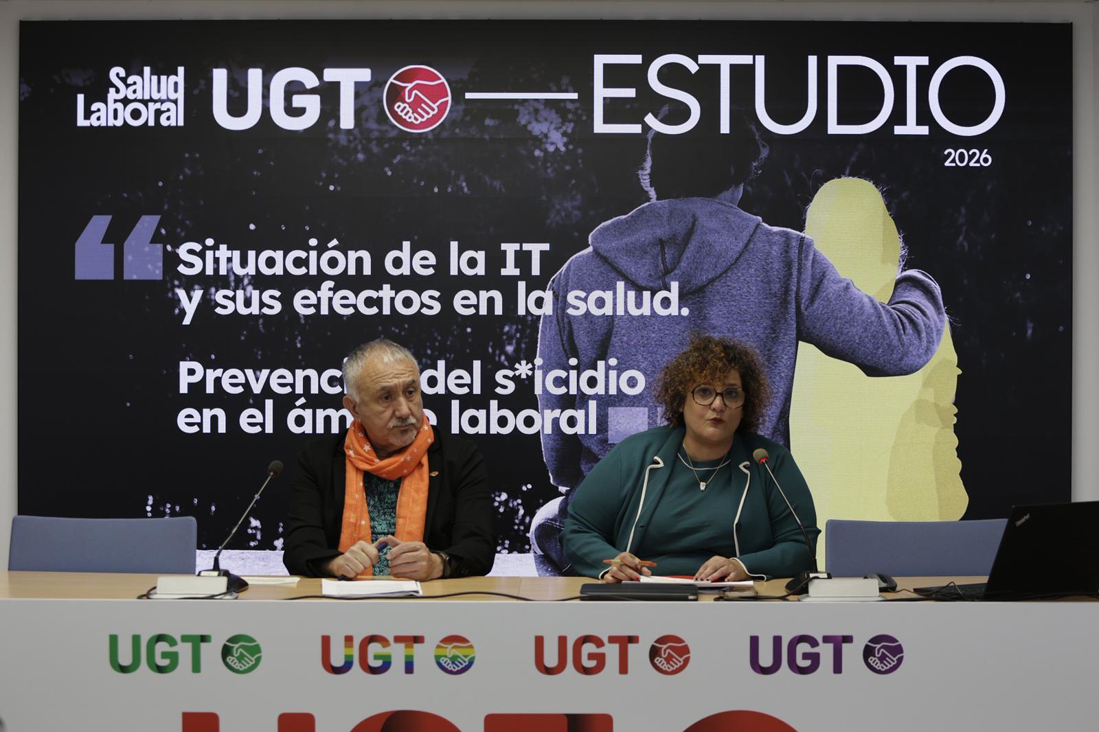 El secretario general de UGT, Pepe Álvarez, y la secretaria de Salud Laboral de UGT, Patricia Ruiz, han presentado este miércoles, en rueda de prensa, el informe Situación de la IT y sus efectos en la salud. La prevención del suicidio en el ámbito laboral.